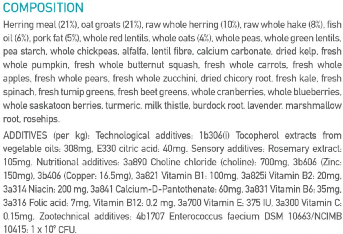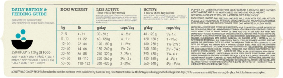 Acana Classics Wild Coast Acana Wild Coast bereid met duurzaam gevangen vis, gevangen vis, gevangen bij North Vancouver Island en vervoerd naar onze keuken vers en heel, en daardoor rijk aan natuurlijke voedingsstoffen en smaak.Vrij van hoog glycemische granen, is Acana rijk aan voedende vis eiwitten en omega-3 vetzuren om top conditie te stimuleren. Voedingsadvies: Gewicht hond (kg) Niet-actief (gr/dag) Actief (gr/dag) 2 40 60 5 60 120 10 120 180 20 200 300 30 270 420 40 330 510 50 400 600 60 450 690 Samenstelling: Haring meel (24%), Gesneden haver (23%), Verse hele haring (10%), Verse hele bot (6%), Haring olie (6%), koudgeperste canola olie, Verse hele zilver heek (4%), Hele rode linzen, Hele groenen erwten, Hele groenen linzen, Hele garbanzo bonen, Hele gele erwten, Hele haver, Zon gedroogde alfalfa, Linzen vezel, Gedroogde bruine zeewier, Verse pompoen, Verse butternut squash, Verse pastinaak, Verse groene boerenkool, Verse spinazie, Verse wortelen, Verse Red Delicious appels, Verse Bartlett peren, Gevriesdroogde haring (0.1%), Verse cranberries, Verse bosbessen, Cichoreiwortel, Kurkuma, Mariadistel, kliswortel, Lavendel, heemst wortel, rozenbottels. Analytische bestanddelen: Ruw eiwit 29 %, Ruw vet 17 %, Ruwe as 7.5 %, Ruwe celstof 5 %, Vocht 12 %, Calcium 1.1 %, Fosfor 0.9 %, Omega-6 vetzuren 2.4 %, Omega-3 vetzuren 1.4 %, DHA / EPA 0.4 % / 0.3 %. Glucosamine 700 mg/kg. Chondroitine 900 mg/kg Toevoegingen: Tocoferol rijk extract van natuurlijke oorsprong. Nutritionele toevoegingen: Vitamine A: 7500IU, Vitamine D3: 500IU, Vitamine E: 100IU, choline chloride: 500mg, E6 (Zink): 100 mg, Vitamine B5: 12,5. Zoötechnische toevoegingen: Enterococcus faecium NCIMB10415: 600×10 ^ 6 UFC. Verkrijgbaar in: 340 gr, 2 kg, 6 kg, 11,4 kg en 17 kg.