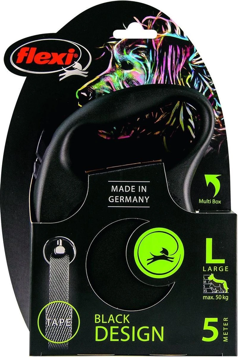 Het is mogelijk om de Black Design L Tape uit te breiden met de Flexi Multi Box (poepzakjes- of snackhouder). De lijn is verkrijgbaar in verschillende maten, afhankelijk van het gewicht van je hond. De Black Design-lijn bevat zwarte rollijnen met opvallende, gekleurde accenten.
